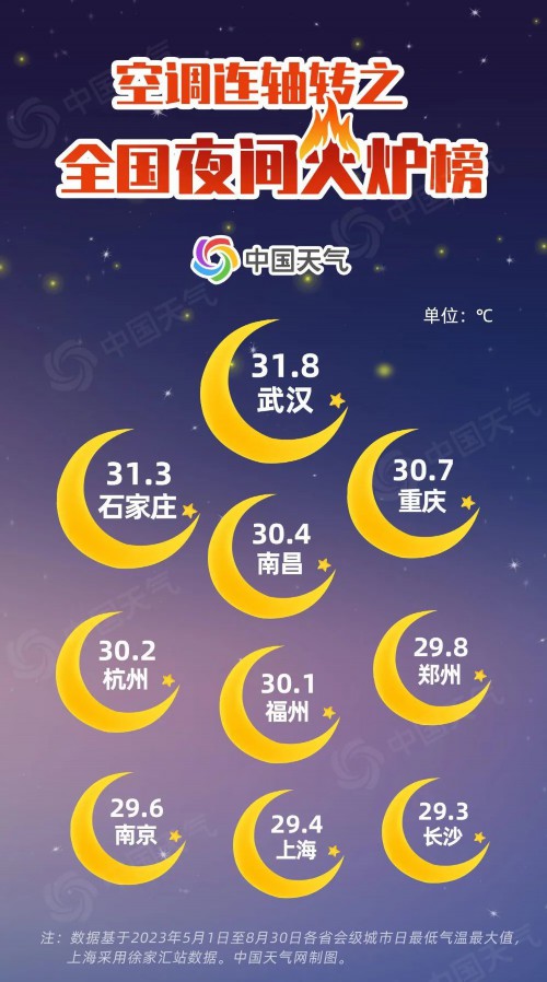 这个夏天,还有一些地方体验到了白天夜晚连轴热的煎熬,空调几乎天天加班。从中国天气网统计的各省会级城市夜温最高纪录来看,武汉凭借31.8℃的最低气温,妥妥成为夜间火炉王,并且还打破当地7月夜温最高纪录。石家庄最低气温31.3℃,创下当地1951年以来夜温最高纪录,冲进榜单第二。重庆、南昌、杭州、福州、郑州、南京、上海、长沙最低气温在30℃左右,进入榜单前十。