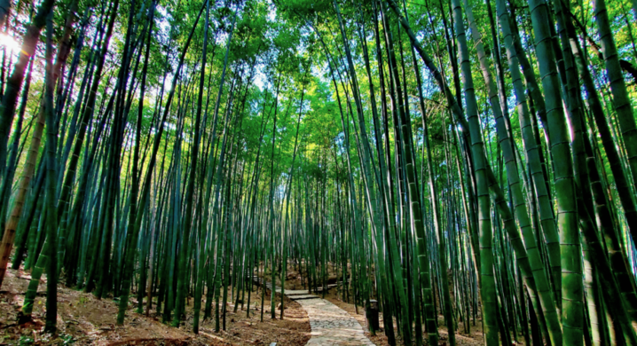 环绕九龙潭的竹林深处有一条蜿蜒山道,通向竹海的神秘幽静之处,山道两边翠竹挺拔,间杂低矮灌木,起伏错落。