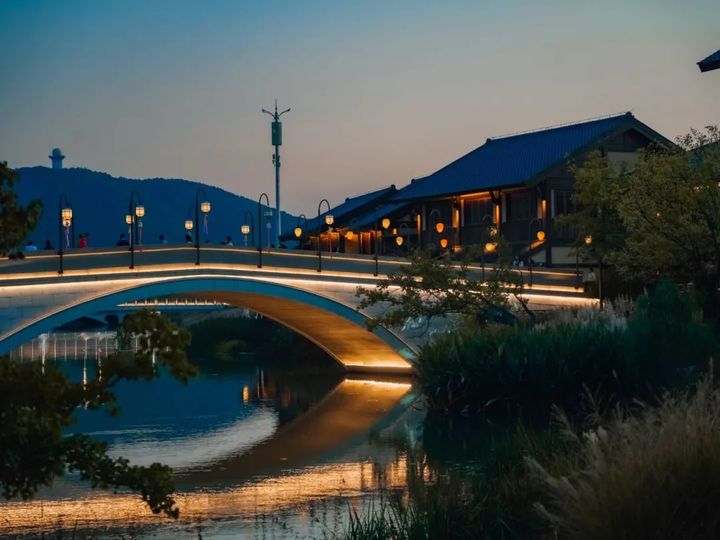 晚风轻拂过桥面上的灯笼,蓝色灯光映照着河道里摇曳的乌篷船,燥热感自此消失。