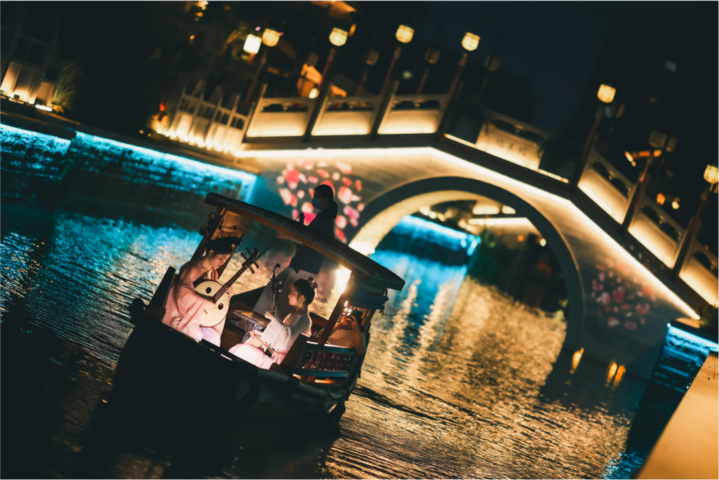 乘一艘竹筏,于夜色中穿行。低头水波似星光,船动月影摇,抬首近距离观赏光影水秀,享受温柔惬意的夜生活。
