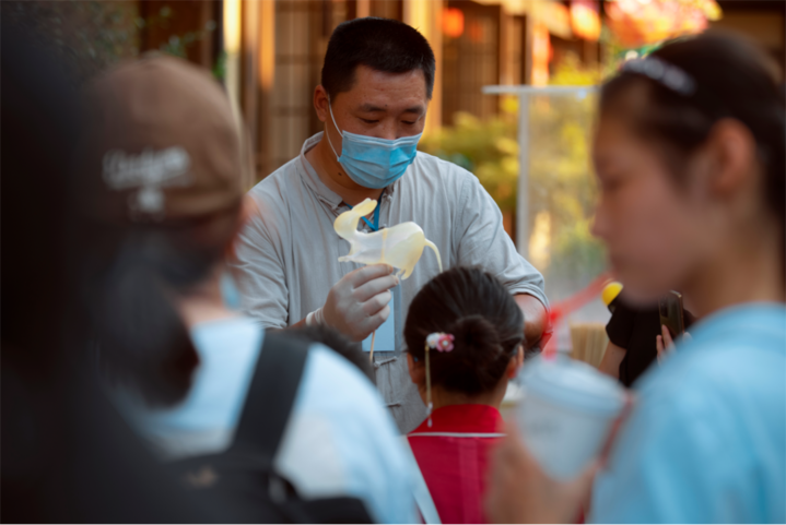 在这里,还能去铺子里体验香囊、剪纸等各项手作,或是和朋友体验生肖吹糖的快乐。