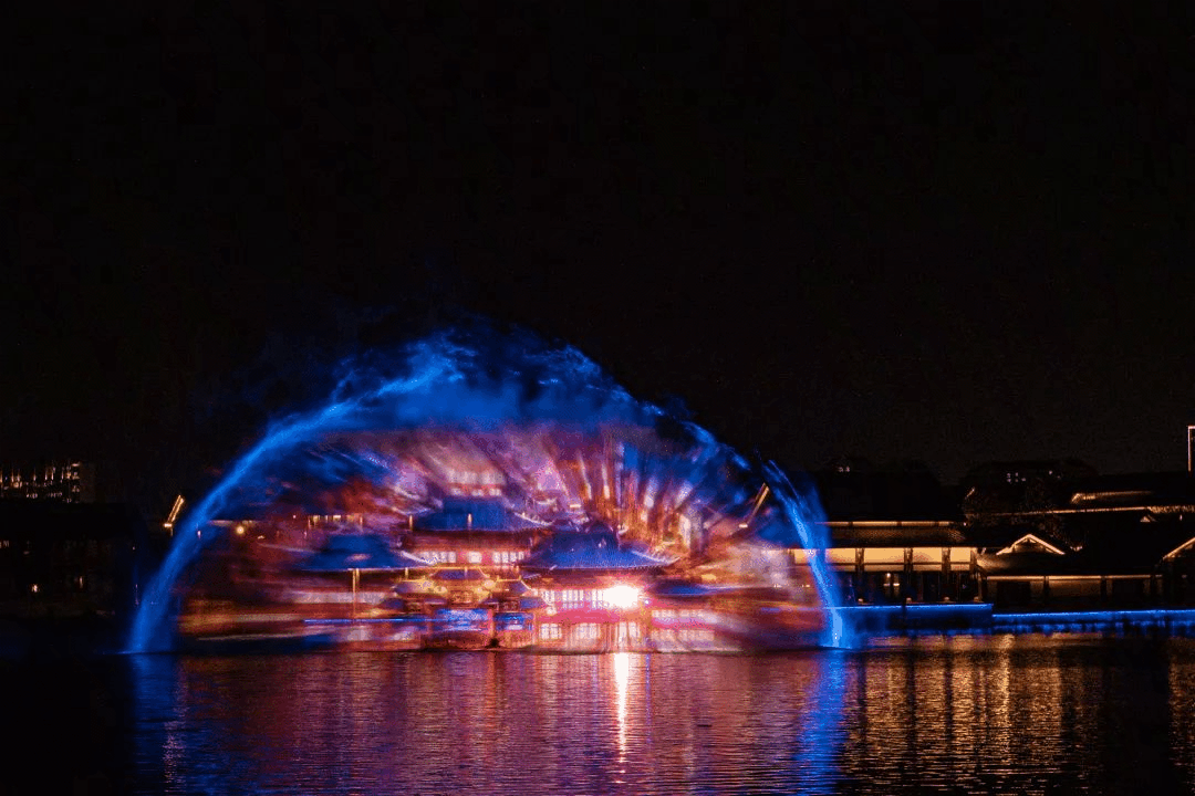 夜晚最不能错过的就是水幕秀。水幕骤起舞,入镜百画廊,随着《—梦千年°》的水幕灯光秀,—起探听千年古今的对话。