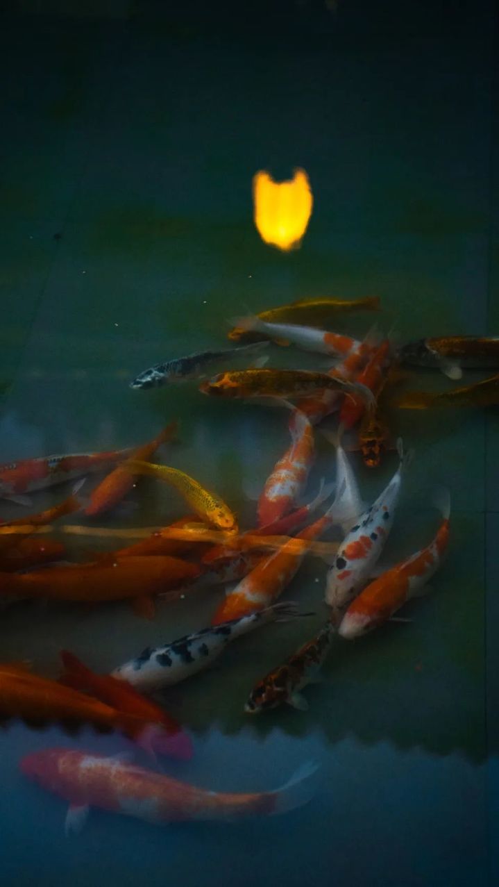 向湖面撒下一些鱼食,看水底游动的锦鲤争相夺食,绚烂的色彩与水中的倒影呼应,流光溢彩,亦虚亦实。