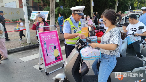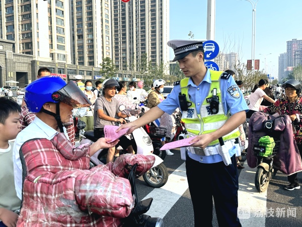 徐州交警支队开发区大队宣传民警提早赶往辖区桃园路小学门前,通过面对面交流、发放交通安全宣传单的方式,为学生们及家长普及交通安全常识,提醒学生们在上下学途中要注意避让周边车辆,不要在马路上随意嬉笑打闹,注意红绿灯等,同时提醒送学家长在骑行非机动车时,要时刻注意交通安全,正确佩戴好安全头盔,切勿闯红灯和不按规定道路行驶。