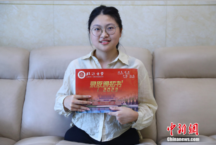 图为参加今年高考的蒋张子怡收到了山东临沂大学的录取通知书。中新社记者 刘占昆 摄