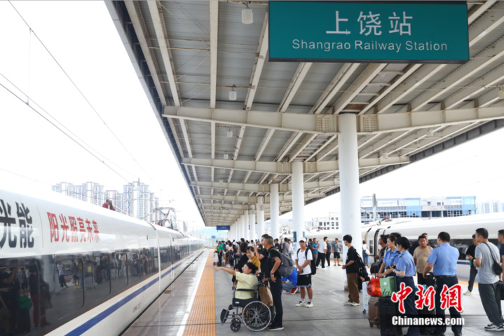 图为8月31日下午,江西上饶站,蒋张子怡在父母的陪伴下等待高铁进站。中新社记者 刘占昆 摄