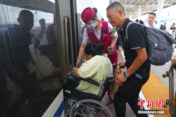 图为8月31日下午,蒋张子怡在列车工作人员的帮助下从江西上饶站登上高铁。中新社记者 刘占昆 摄