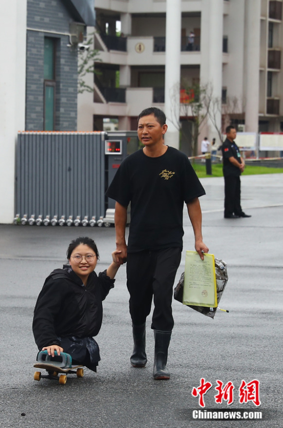 图为6月8日,高考结束后,蒋张子怡的父亲背着她往外走,母亲拿着女儿的滑板跟在后面。中新社记者 刘占昆 摄