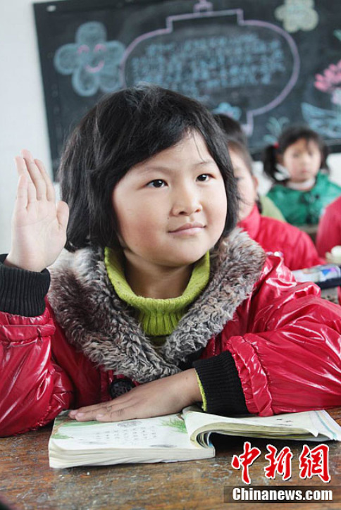 图为2012年,年仅7岁的蒋张子怡在课堂上踊跃举手回答老师提问。卓忠伟 摄