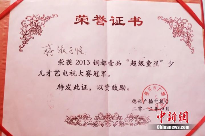 图为2013年4月,蒋张子怡获得的少儿才艺电视大赛冠军证书。(受访者供图)