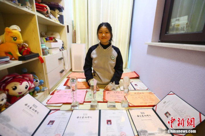 图为2021年,蒋张子怡展示从小到大获得的各类证书。(资料图)中新社记者 刘占昆 摄