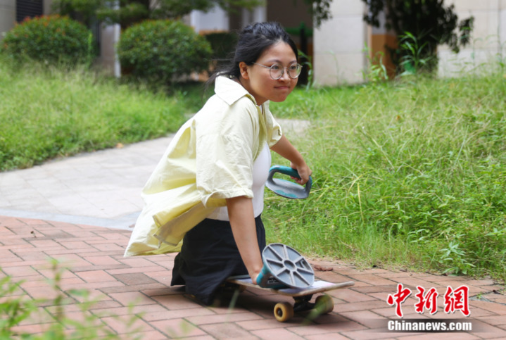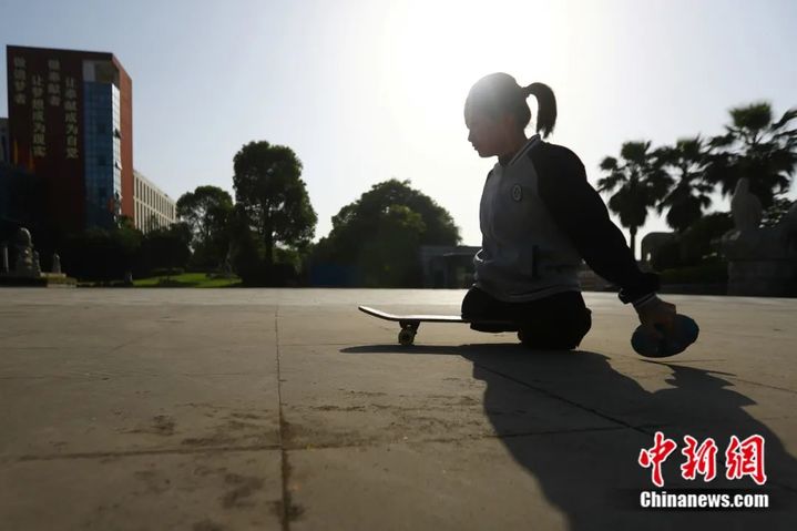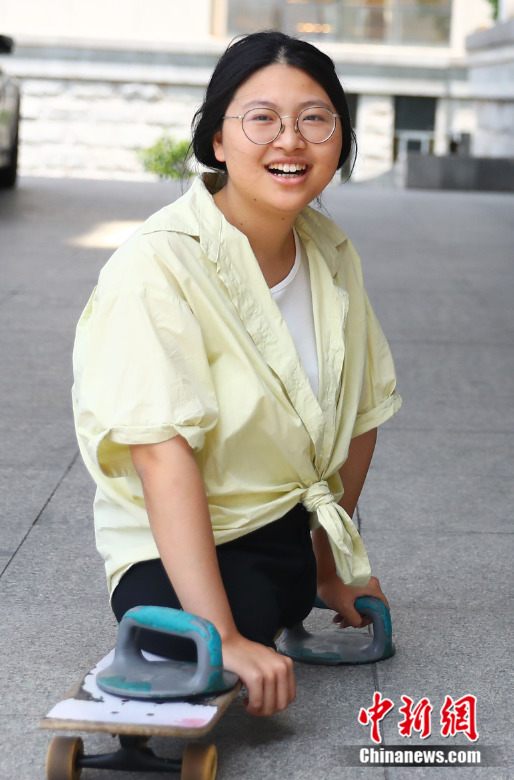 图为以滑板代步的蒋张子怡。中新社记者 刘占昆 摄