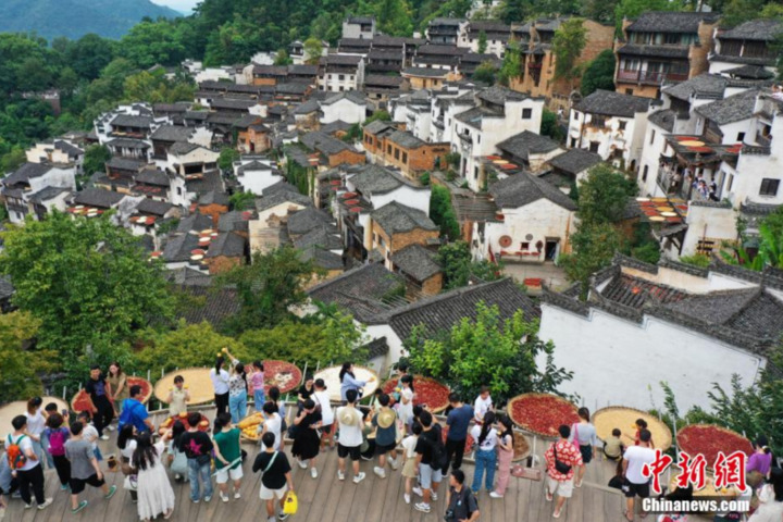 图为8月26日,航拍江西婺源县篁岭古村独特的“晒秋”农俗景观,吸引众多游客参观欣赏。中新社记者 刘占昆 摄