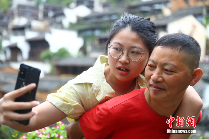 图为2023年暑假,在江西婺源篁岭古村,蒋张子怡倚靠在父亲背上用手机拍照留念。中新社记者 刘占昆 摄