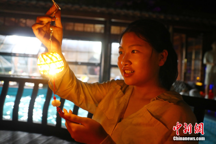 图为2023年暑假,蒋张子怡拿起手工制作的灯笼许下“永远快乐”的愿望。中新社记者 刘占昆 摄