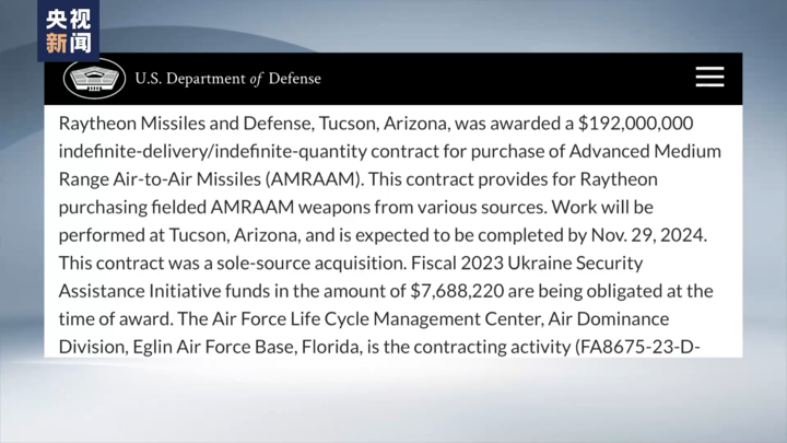 据美国国防部网站消息,当地时间8月31日,美国国防部与美国军火巨头雷神公司签署了价值1.92亿美元的合同,用于采购先进中程空空导弹以支持乌克兰。