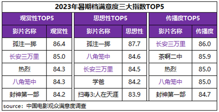 其中《孤注一掷》《长安三万里》分别以86.4分、85.1分为档期满意度单片冠亚军,《八角笼中》《茶啊二中》《热烈》《封神第一部》等四部影片满意度均超84分。