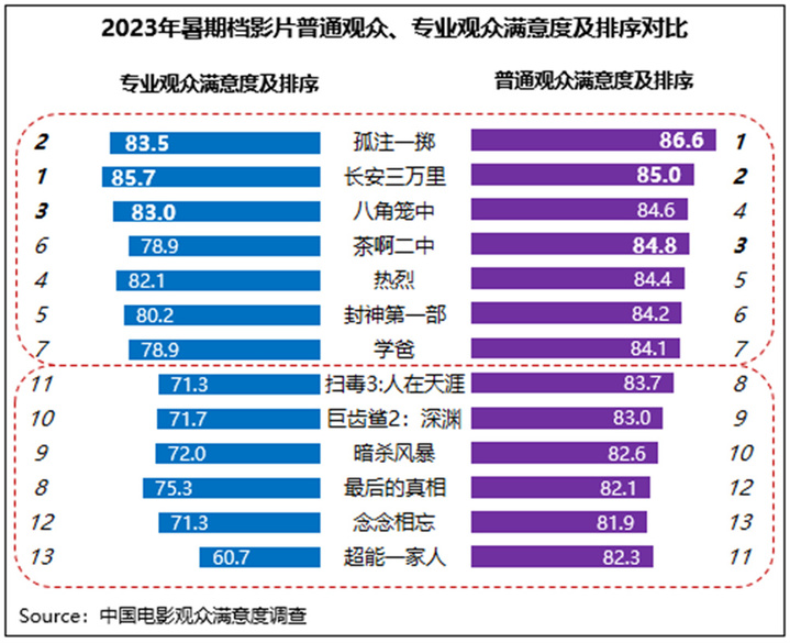 具体来看,《孤注一掷》《长安三万里》均居不同观众满意度排名的前两位,其中普通观众对《孤注一掷》评价最高,专业观众则最青睐《长安三万里》;其中《长安三万里》是档期内唯一一部专业观众评分高于普通观众的影片,其专业观众满意度仅次于《满江红》,居2023年调查影片的第二位。