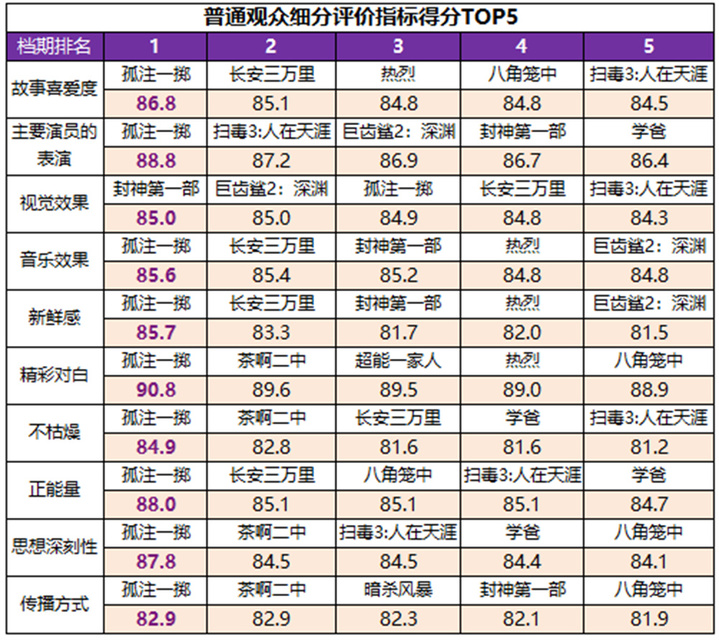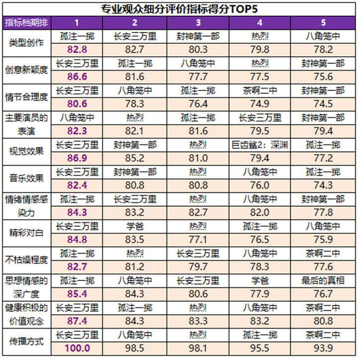 在专业观众评价体系中,《长安三万里》有7项指标得分居档期第一位,其中传播方式为满分100分,健康积极的价值观念、视觉效果和创意新颖度得分均超86分;《孤注一掷》的类型创作、情绪情感感染力、不枯燥和思想情感的深广度得分,以及《八角笼中》主要演员的表演得分均居档期第一位。此外,《热烈》主要演员的表演、不枯燥程度,《封神第一部》的视觉和音乐效果,以及《学爸》的精彩对白得分均居档期第二位。