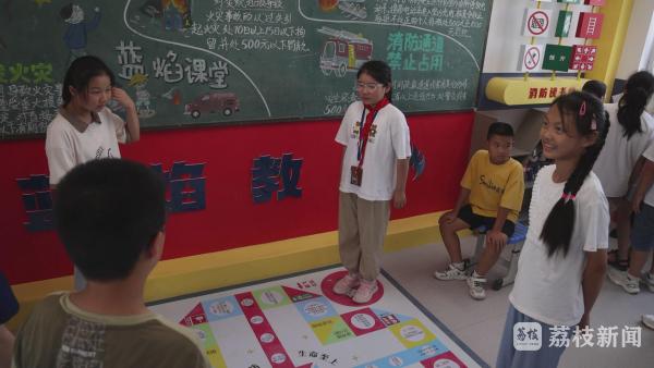 除此之外,蓝焰教室内还设置消防安全飞行棋,需要通过了解相关的消防安全知识才能进行游戏操作。消防员也向同学们讲解灭火器的识别以及使用方式,并让同学们自身体验,加强灭火器的使用知识。