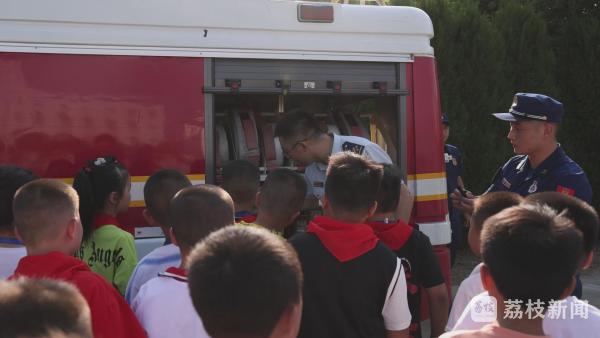 在学校操场,老师组织同学们开展课外消防活动。在户外,老师挑选几名同学与消防员进行拔河比赛,在同学们一声声呐喊加油中,同学们不负众望险胜消防员。获得胜利后,消防员挑选几名学生来到最前方穿戴消防装备。一名名消防员帮助同学们穿戴好装备,来到同学前面走秀,与同学们合影。最后在全校老师带领下,有序安排全校同学们近距离参观消防车辆。