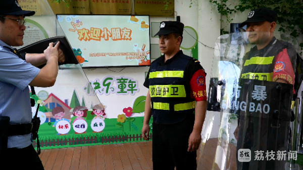 民警首先来到了学校的门卫室,对里面的一键报警装置、内部视频监控系统、门前安防设施等进行全面测试检查。随后,通过现场演练,向保安演示了钢叉、防暴盾牌等器材的正确使用方法。