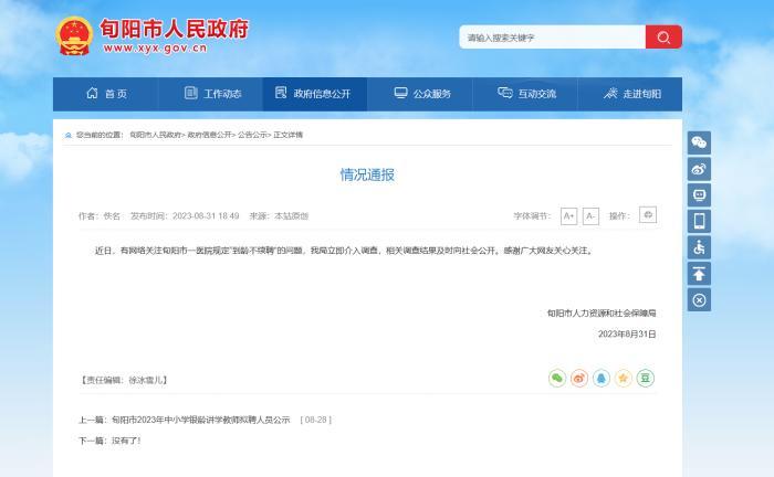 8月31日,据旬阳市人民政府网站发布情况通报,旬阳市人力资源和社会保障局已对此介入调查,相关调查结果及时向社会公开。