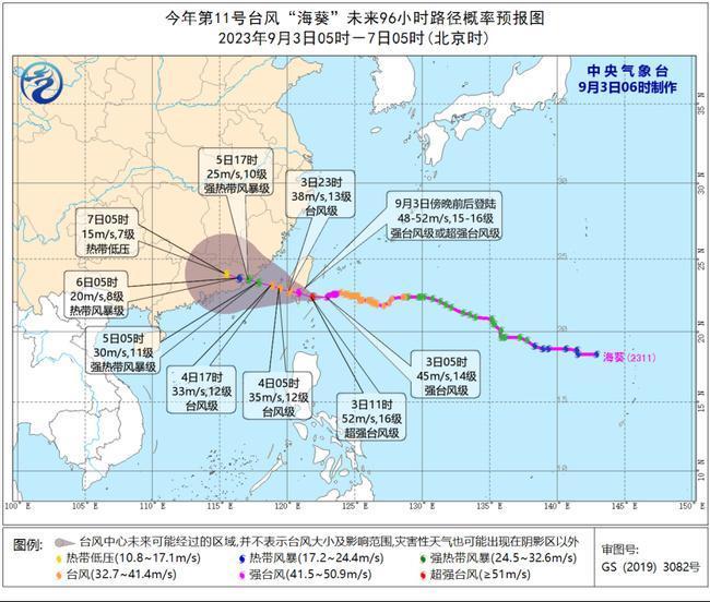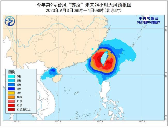 大风预报:9月3日08时至4日08时,受“苏拉”影响,北部湾、琼州海峡以及广西南部沿海、海南岛北部沿海等地将有6-7级大风,其中北部湾部分海域将有8级、阵风9-10级的大风;受“海葵”影响,巴士海峡、台湾海峡、台湾以东洋面、东海南部及钓鱼岛附近海域以及浙江南部沿海、福建沿海、台湾岛沿海将有6-8级、阵风9-10级大风,部分海域或地区的风力有9-12级,阵风13-14级,“海葵”中心经过的附近海面或地区的风力有13-16级,阵风17级。