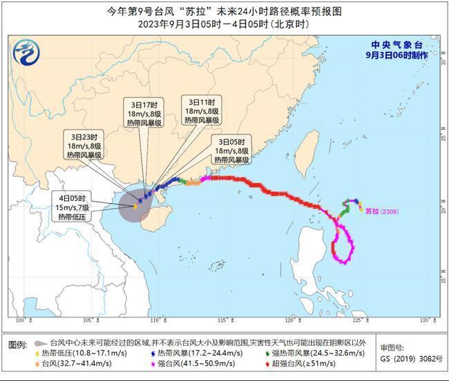 另外,今年第9号台风“苏拉”(SAOLA)(热带风暴级)的中心今天(9月3日)早晨5点钟位于广东省湛江市境内,就是北纬21.2度、东经109.8度,最大风力有8级(18米/秒),中心最低气压为998百帕。