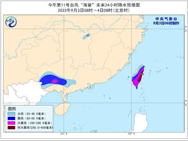 降水预报: 9月3日08时至4日08时,受“苏拉”和“海葵”影响,广西中南部、广东西南部、台湾岛等地部分地区有大到暴雨,其中,广西中南部、台湾岛中东部等地部分地区有大暴雨,台湾岛东部部分地区有特大暴雨(250-600毫米)。