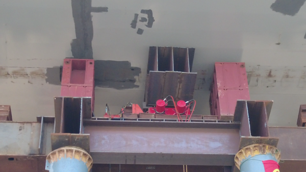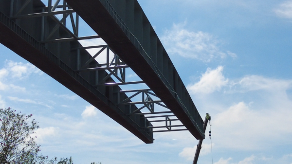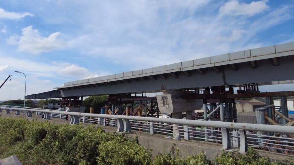 导梁推到对面支架后会拆除一半,而后面的钢箱梁则要焊接延长,待主跨顶推完成并且连接边跨后,再落梁至桥墩支座,落梁高度达3.6米左右。项目部采用步履式顶推方案进行施工。千斤顶每15分钟往前顶推38厘米,“巨无霸”钢箱梁以肉眼看不出的速度每天前进6-10米。预计9月底左幅完成顶推施工,10月底右幅完成顶推施工。