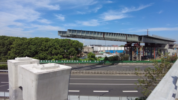 当天上午,在312国道XW11标项目工地看到,一根长46米的导梁斜横在锡通高速无锡段上空,已经跨过中央绿化带位置。导梁后面连着巨大的钢箱梁,高速公路上车辆照常通行,但是一侧应急车道内放置了一些圆锥桶,提示车辆不要在施工区域下方停车。江苏省交通工程集团312国道XW11标项目总工表示:跨锡通高速曲线钢箱梁分左右幅实施顶推,其中左幅跨径为52.8米+80米+47.2米,右幅跨径为50米+80米+55米,钢箱梁采用全焊单箱三室断面,左右幅总重3780吨。