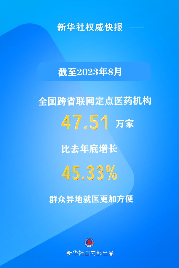 国家医保局副局长黄华波9月4日在国务院政策例行吹风会上介绍,截至2023年8月,全国跨省联网定点医药机构47.51万家,比去年底增长45.33%。