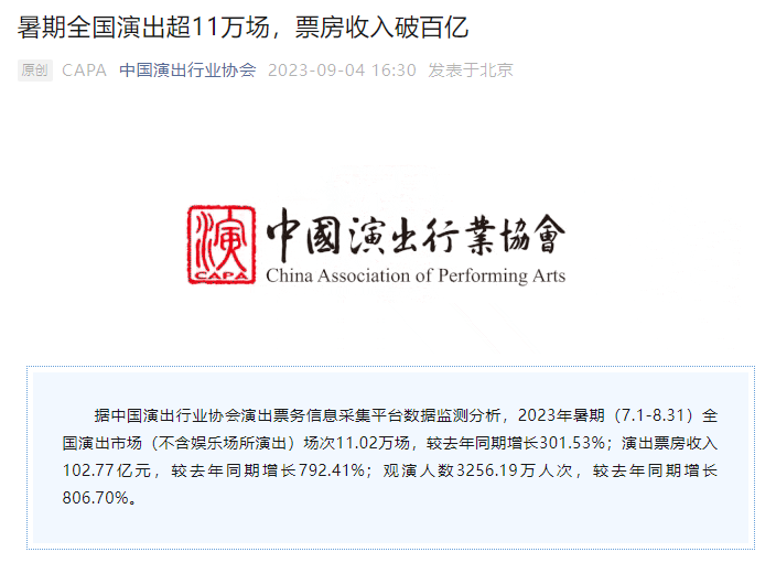据中国演出行业协会演出票务信息采集平台数据监测分析,2023年暑期(7.1-8.31)全国演出市场(不含娱乐场所演出)场次11.02万场,较去年同期增长301.53%;演出票房收入102.77亿元,较去年同期增长792.41%;观演人数3256.19万人次,较去年同期增长806.70%。
