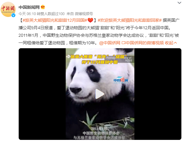 据英国广播公司9月4日报道,爱丁堡动物园的大熊猫“甜甜”和“阳光”将于今年12月返回中国。2011年1月,中国野生动物保护协会与苏格兰皇家动物学会达成协议,“甜甜”和“阳光”被一同租借给爱丁堡动物园,租借期为10年。