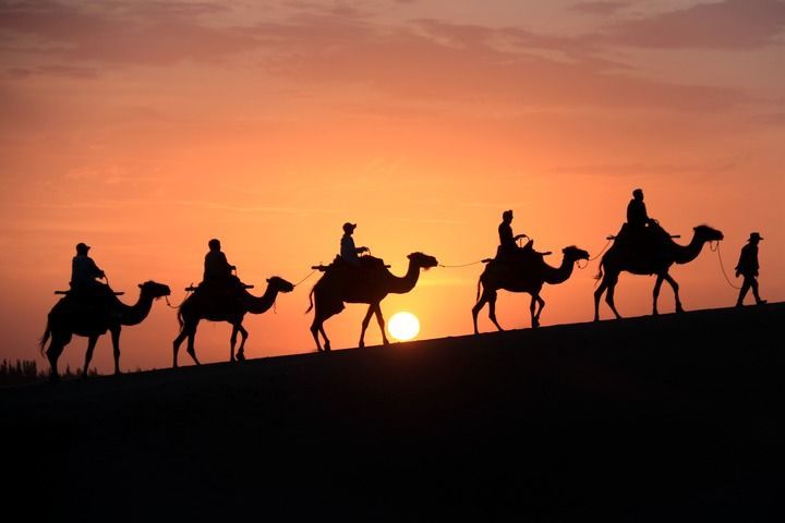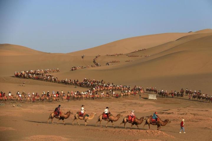 从晨光熹微到夕阳西下,在敦煌市鸣沙山月牙泉景区,驼队载着游客在沙丘间蜿蜒穿行,浩浩荡荡的队伍,一眼望不到头。及至夜幕降临,游客仍不愿离去。他们自发聚集在鸣沙山坡头,打开手机灯光,随风挥舞尽情歌唱,开启一场场沙漠万人演唱会。