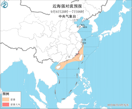 9月6日夜间,福建沿海将有8~9级的雷暴大风。