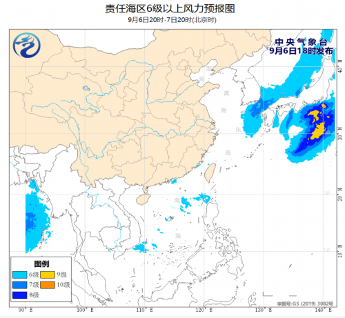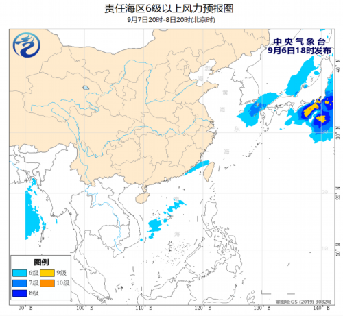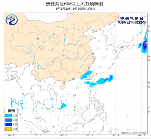 9月6日夜间至9日白天,台湾海峡、巴士海峡、南海东北部和中东部海域、南海西南部海域将有4~6级、阵风7级的旋转风或西南风。