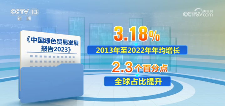 再来分享一组数据。近日,《中国绿色贸易发展报告2023》发布,报告显示,近年来我国绿色贸易规模基本保持增长态势,2013年—2022年年均增长3.18%,在全球占比提升2.3个百分点。