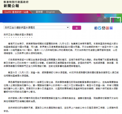 新闻公报称,行政长官李家超十分关注全港多个地区出现严重水浸的情况,并指示各部门全力应对。保安局辖下的紧急事故监察及支援中心已于昨晚11时05分启动。纪律部队正处理紧急求助个案。多个政府部门,包括渠务署、路政署、民政事务总署及相关部门正全力采取应对行动,并前往受影响地区处理各种情况。
