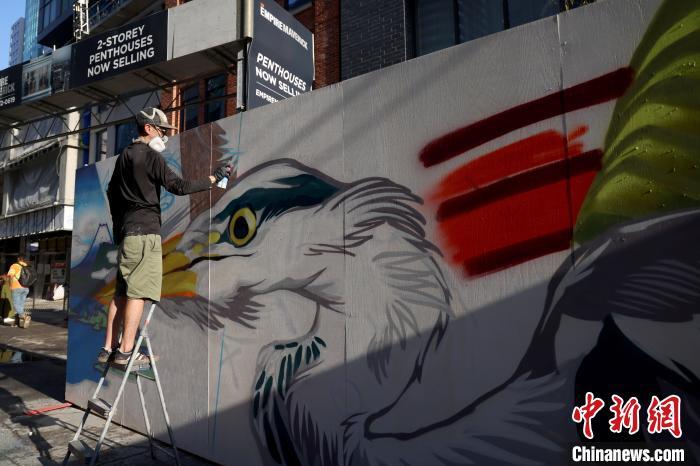 当地时间9月7日,加拿大多伦多,第48届多伦多国际电影节启幕。图为一位画师在电影节街区绘制本届电影节开幕影片、日本动画大师宫崎骏新作《男孩与苍鹭》的大型户外海报。 中新社记者 余瑞冬 摄
