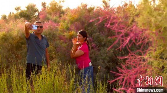 在新疆巴州尉犁县境内的塔里木河两岸附近,一墩墩紫色、绿色、粉红色交织在一起的红柳树花,把塔里木河两岸印染,吸引一些游客驻足在红柳树前拍照打卡。