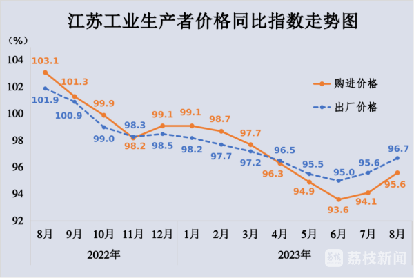 记者获悉,8月份,江苏工业生产者出厂价格同比下降3.3%,环比持平;工业生产者购进价格同比下降4.4%,环比上涨0.1%。1-8月,江苏工业生产者出厂、购进价格同比分别下降3.5%、3.8%。