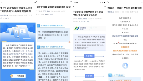 连日来,江苏各地积极调整优化房地产政策,释放积极信号。9月7号晚间南京发布多项细化措施,促进房地产市场发展。9月9号,南京雨花台区、栖霞区、江北新区、江宁区发布新建商品房购房补助及“卖旧换新”政策实施细则。南京有关部门还精准对接居民住房改善需求,推出了换新购服务,旨在提高改善住房置换效率。