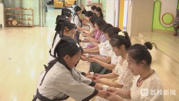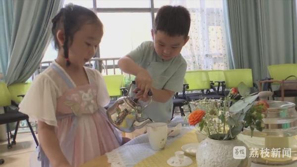 在淮安市越秀幼儿园,小萌娃们身着汉服,摇身一变成为小小茶艺师,为老师们泡上一壶沁人心脾的花茶。萌娃们细致地摆好茶具,置茶、冲泡、出汤、分茶……每一个泡茶步骤都认真仔细,有模有样。他们端着茶杯恭敬地走到老师面前,双手奉上清甜的花茶,老师们双手接过茶杯细细品茗,浓浓的师幼情谊伴随温润沁甜的茶香,温暖着老师们的心田。