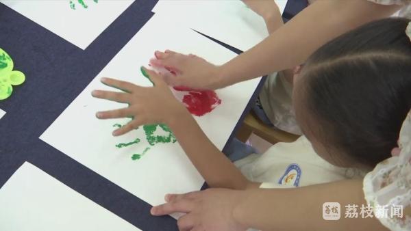 在绘画教室,大手牵小手的创意手印画也十分有趣,老师们的右手和萌娃们的左手都涂上了鲜艳的颜料,再一起将涂上颜色的手印在画纸上,手牵手,印连印,寓意着心手相牵、密不可分的师生情谊。
