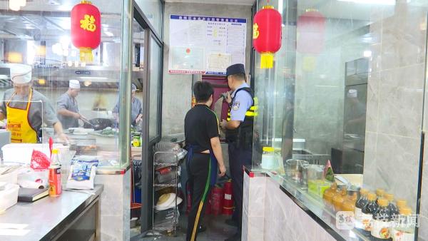 这是南京建邺区南湖刚搬过来不久的一家餐饮店。餐饮场所,是人间烟火气所在,却也是火灾易发区域,民警对店里的消防设备、安全通道,员工使用灭火器的情况等一一进行了检查。