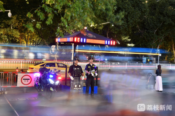 9月8日晚,记者在新街口商圈看到商圈内警方联勤联动点,警灯闪烁民警辅警装备佩戴整齐。民警通过守点、车巡、步巡等方式在商圈内开展立岗值守和街面盘查,让游客“见警察、见警车、见警灯”,最大限度将警力推向街面,着力营造守护群众身边安全的良好氛围。