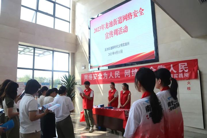 2023年9月11-17日 是国家网络安全宣传周 大家在享受如今互联网带来便利的同时 也要时刻注意 互联网背后存在的巨大隐患 电信诈骗、信息泄露、 网络谣言、恶意软件…… 为提升广大干部群众网络安全意识和防护技能,9月11日,六合区龙池街道宣传科联合街道团工委等部门以“网络安全为人民,网络安全靠人民”为主题,开展“网络安全进机关”宣传活动。 活动现场,工作人员和志愿者们通过宣读倡议书、悬挂横幅、摆放宣传展板,观看宣传视频、发放宣传折页和小礼品、开展签名仪式、现场咨询互动等多种形式,向机关干部讲解了常见的网络诈骗手段,帮助机关干部更好地了解、感知身边的网络安全风险,大家积极互动交流,现场氛围活跃。本次宣传活动共发放网络安全宣传资料200余份,接受咨询30余人次。 活动结束后,大家纷纷表示:“作为机关干部,我们在享受网络空间带来便利的同时,以后要带头自觉规范网上活动行为,积极弘扬正能量,同时从我做起,向身边人宣传网络安全相关知识,不断增强网络安全意识,强化维护网络安全的行动自觉。” 下一步,六合区龙池街道将坚持线上与线下有机结合,发动各相关部门、各村(社区)、群众等各方力量广泛参与网络安全宣传活动,利用微信公众号等新媒体平台做好媒体传播,全面营造全社会共筑网络安全防线的浓厚氛围。 倡 议 书 网络空间是亿万民众共同的精神家园,每一位网民都是构成网络社会的一份子。清朗的网络空间需要你我参与,文明的网络秩序需要你我共建,健康的网络文化需要你我传承。在此,向广大网民发出如下倡议: 一、争做自觉维护网络安全的法治卫士。遵守宪法和《国家安全法》、《网络安全法》等法律法规,增强守法意识,严格遵守互联网法律法规与社会公德,自觉约束和规范自身网络行为。 二、争做自觉维护网络安全的文明卫士。积极提升个人网络素养,坚决抵制虚假信息和网络谣言,坚决反对网络暴力,倡导正确思想、驳斥错误言论,唱响网上“中国好声音”。 三、争做自觉维护网络安全的防御卫士。增强个人网络安全意识,自觉提高网络安全防护能力,不进可疑网站,不下载不明软件,主动防范自己和他人的信息泄露,拒绝非法网络借贷。合理使用网络资源,推动网络空间安全发展。 四、争做自觉维护网络安全的侦查卫士。自觉提高警惕和防护意识,提高对网络信息的鉴别能力,积极举报违反国家法律、影响国家安全和社会稳定、破坏民族团结和宗教信仰的网络信息,让互联网在法治轨道上健康运行。 让我们从现在做起,从自己做起,用实际行动提高网络安全意识,增强网络安全防护技能,携手共建文明有序、绿色健康的网络空间,共筑国家安全防线! 龙池街道新时代文明实践所