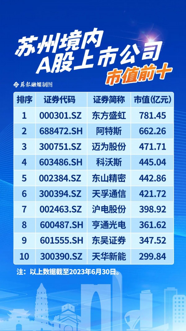 今天上午召开的 2023苏州数字金融大会发布了苏州境内A股上市公司市值前十、苏州境内A股上市公司2023年半年度营业收入前十、苏州境内A股上市公司2023年半年度研发支出前十、2020年以来苏州境内A股上市公司再融资募资总额前十榜单。